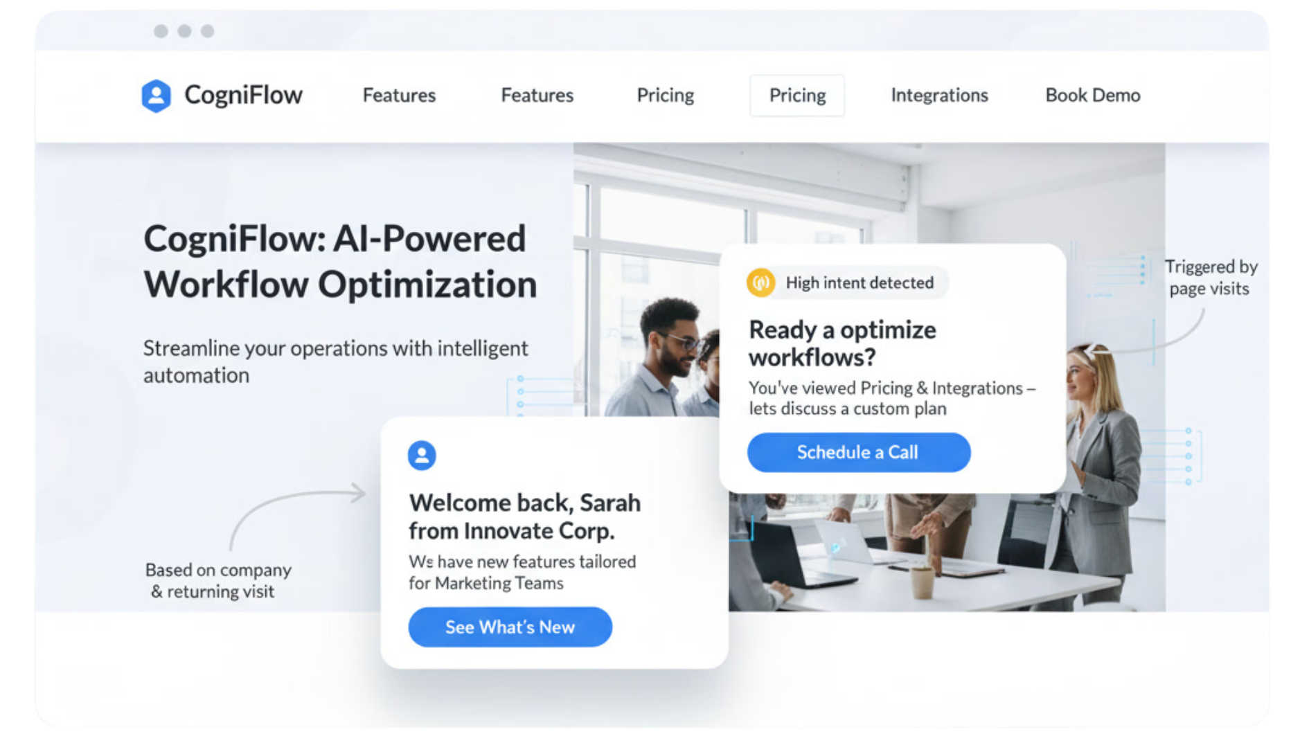 Tailor messaging, content, and calls-to-action based on who is visiting, where they came from, their industry, and their buying intent.