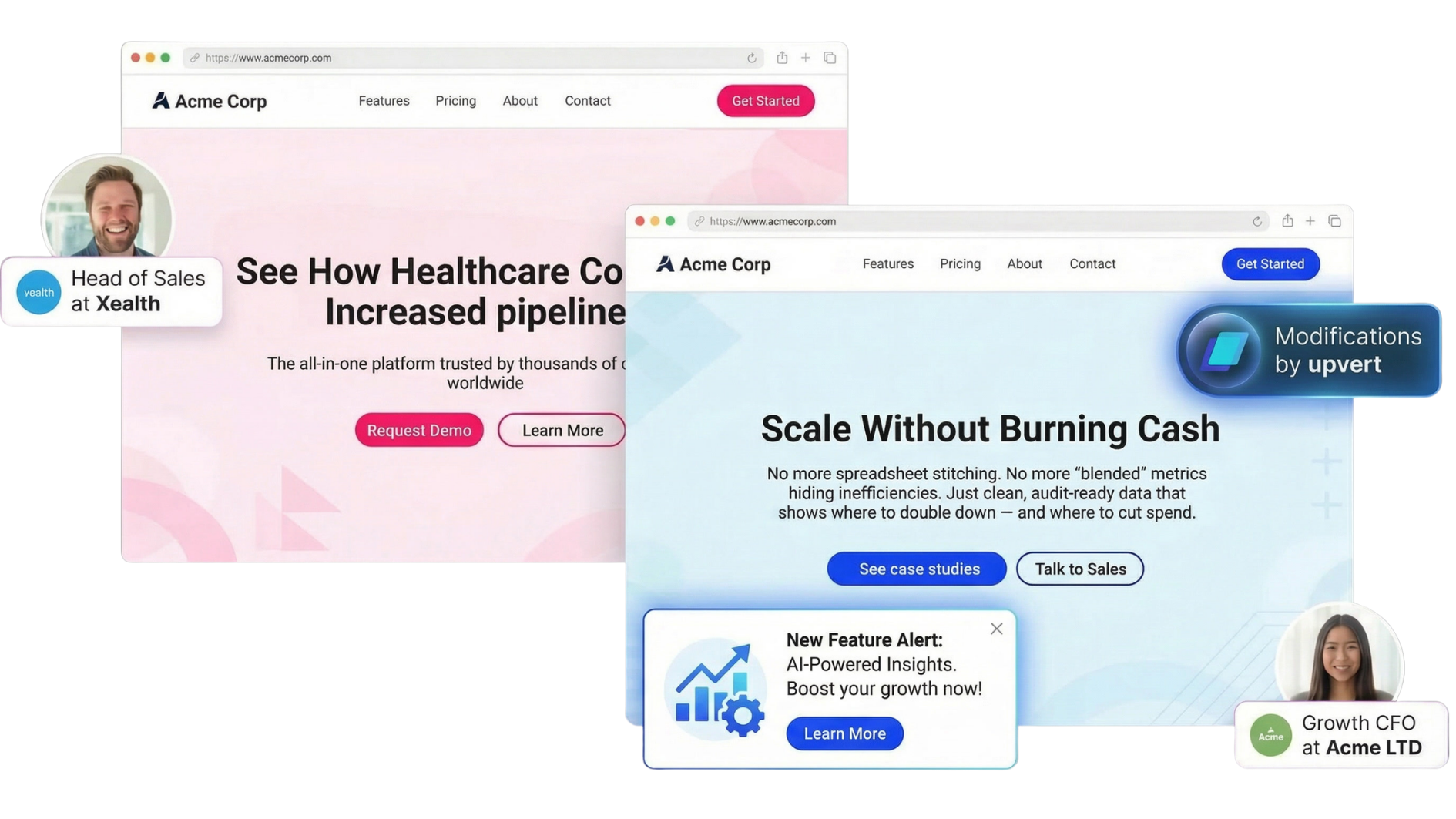 Upvert combines website de-anonymization, personalized microsites, and intent-triggered popups in one platform — giving B2B revenue teams everything they need to convert anonymous traffic into qualified pipeline.