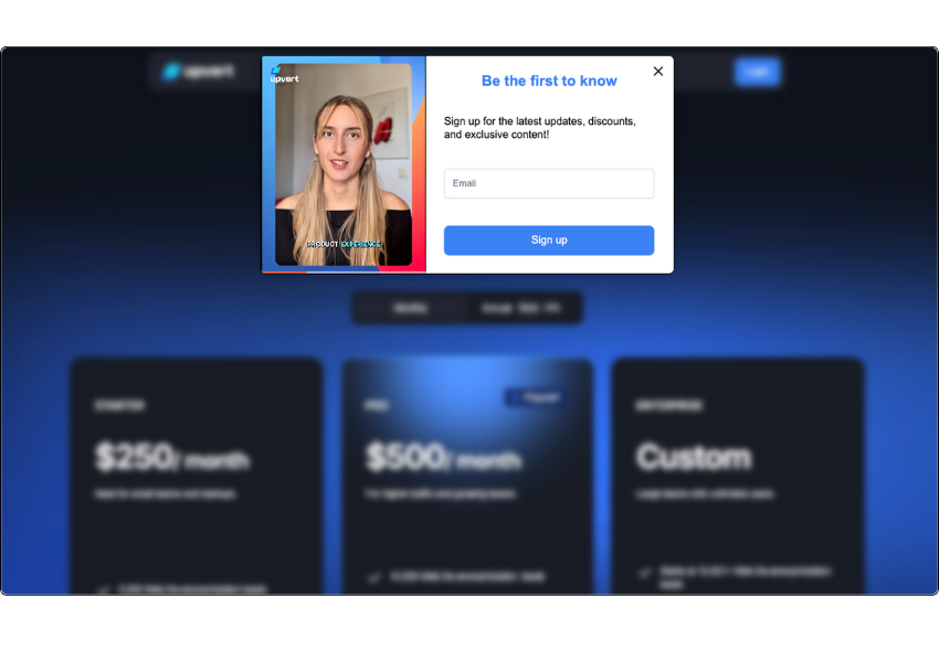 No coding required. Just add the Upvert script to your site, and start building popups that will appear instantly. No developers, no complexity.
